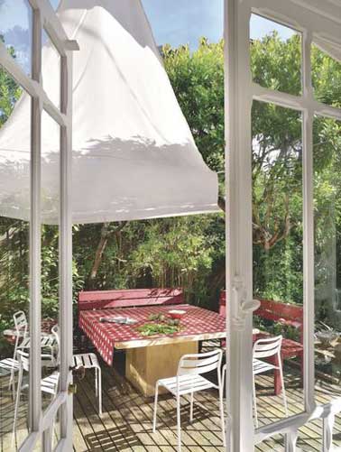 Toit verrière et vigne installent l’ambiance cabanon de cette terrasse. Aménagé avec du mobillier de jardin et des matériaux de récupération, son charme est unique