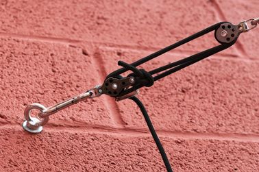 Les fixations murales disposent d’un système de mousqueton pour rapidement poser ou démonter la tente. Les poulies vous aident à plus ou moins tendre votre toile d’ombrage