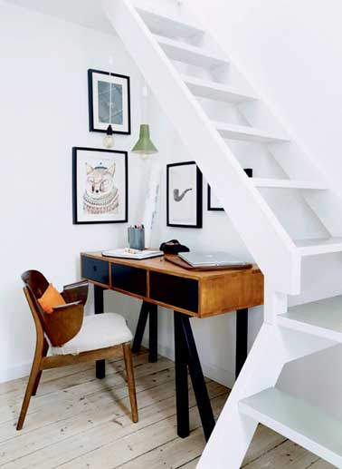 Ce bureau aux formes pures et sa chaise en bois vintage assortie trouvent chacun leur place sous l’escalier en lui donnant une allure scandinave. Les cadres photos noirs disposés contre le mur blanc et les suspensions vintage ajoutent de la couleur à l’ensemble tout en rythmant ce petit espace bien exploité.
