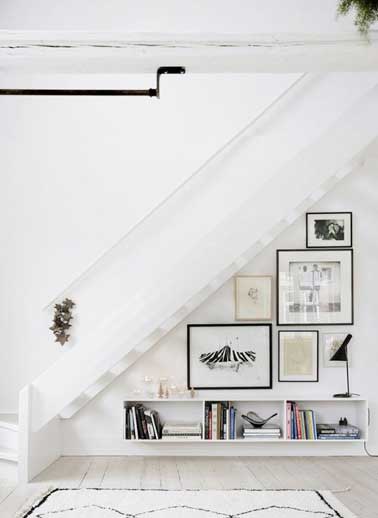 Profitez de la place disponible sous l’escalier pour aménager une mini galerie photos. Commencez par accrocher des photos de plusieurs tailles en les superposant dessous les marches de l’escalier. Puis fixez sous l’installation une console de rangement pour accueillir livres, catalogues d’expo et autres brochures et décorer le tout avec une lampe design et quelques sculptures aux couleurs coordonnées et vous obtenez un espace galerie stylé pour faire la déco d’entrée.