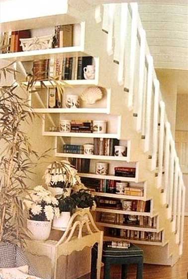 Votre bibliothèque déborde ? Installez des étagères sous l’escalier ! Celles-ci sont construites derrière toutes les marches de l’escalier blanc. Accessibles, elles sont non seulement utiles pour créer des surfaces de rangement supplémentaires mais aussi efficaces pour assurer la déco d’une pièce.