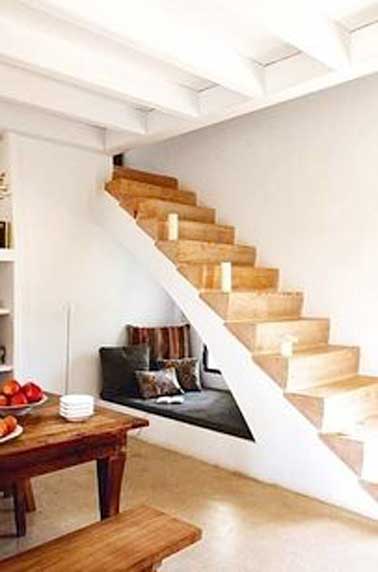 Installez un coin de détente cosy grâce à l’espace disponible sous l’escalier en bois. Ce vrai petit nid douillet, aménagé avec un matelas de sol et des gros coussins contre le mur, assurent des moments de lecture ou de repos inoubliables. Peint de la même couleur que les murs du salon, il sait en plus, se faire oublier.