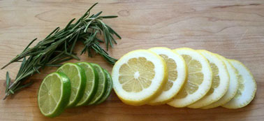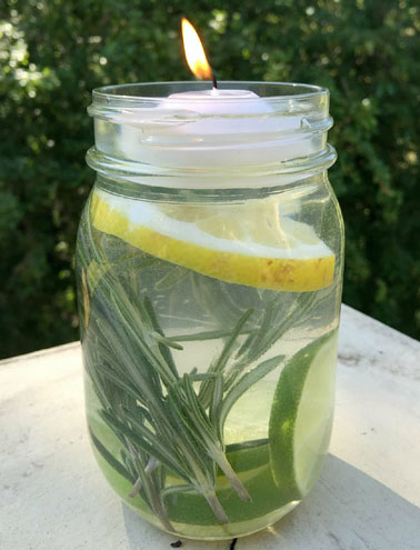 Citrons, limes, romarin, eau, huiles essentielles de citron ou d’Eucalyptus, bougies flottantes à la citronnelle et des pots de verre, ce qu’il faut pour un anti moustique naturel