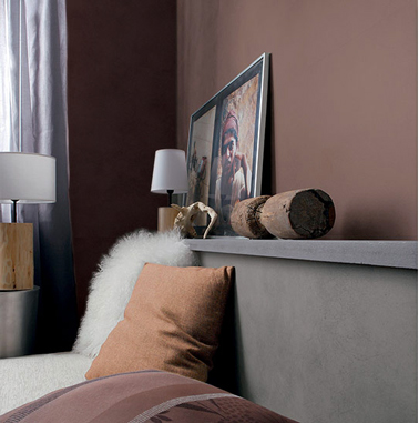 Même recherche d’ambiance intime et confortable dans une chambre avec cette fois-ci une palette de couleurs sourdes. Aux murs les teintes chaleureuses de chocolat et taupe se partagent l’espace avec le gris profond de la peinture qui couvre la tête de lit en bois. Pour donner du relief, un jeu de matières en contraste qui mêlent les effets soyeux, bruts et naturels. Peinture couleur brun taupe ref N3LMI022aD et brun chocolat ref N3LMI032aD collection Maison Leroy Merlin.