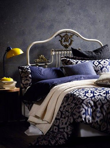 Nous l’avons vu plus haut, les couleurs froides sont idéales dans une chambre, mais cela ne veut pas dire que l’on transforme la chambre en une pièce sans âme ni chaleur pour bien dormir ! En choisissant des bleus et gris dans des tons sombres on reste dans le principe tout en enveloppant la chambre d’une ambiance hyper cocooning. Un bel exemple sur cette photo où les murs sont recouverts d’une peinture à effet mêlant un gris et un bleu aux reflets violet tandis que le linge de lit se décline sans complexe dans un dégradé de bleu et gris intense. Au final un ensemble de teintes sombres qui créent l’intimité dans cette chambre d’adulte qui s’illuminent au côté des touches d’ivoire et du jaune vif de la lampe de chevet.