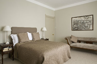 Si vous cherchez une couleur de chambre élégante qui vous permette de bien dormir dans une ambiance sereine, optez pour une dominante de couleur lin et une deuxième couleur en camaïeux pour apporter un contraste doux et chaleureux. C’est l’option retenue pour la déco de cette chambre parentale avec les murs et le plafond peints avec une teinte de lin clair. Les boiseries ainsi que le sol en moquette lui font écho avec un ton de lin légèrement au-dessus. La chaleureuse teinte chamoix du linge de lit et du tissu de la méridienne joue sur les aspects soyeux brillant et mat pour donner du relief à la base monochrome. Quelques touches de blanc complètent l’ambiance zen. Couleur Murs : Old White Bedroom Peinture Farrow & Ball