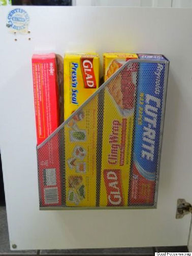 Le rangement des rouleaux de film plastique et d’aluminium au fond du placard c’est toujours un casse-tête lorsqu’il faut en attraper un. Voilà une bonne astuce rangement cuisine pour avoir tous ses rouleaux sous la main : un classeur métallique fixé à l’intérieur de la porte du meuble de cuisine. source : Huffington Post.