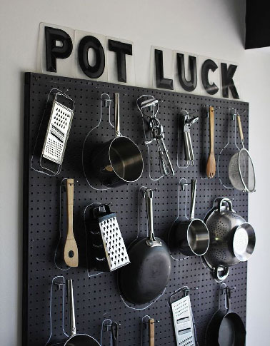 Remplaçant un meuble de cuisine, une plaque d’isorel montée sur un châssis bois puis peinte en noir (ou une couleur en harmonie avec celle dominante dans la pièce) permet de suspendre une bonne partie des ustensiles de cuisine et du même coup résoudre le problème du manque de place dans une petite cuisine. Source: A Beautiful Mess.