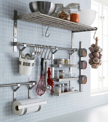 Pour cette idée de rangement des accessoires de cuisine, rendez-vous chez Ikea pour s’équiper de barres et étagères métalliques. Regroupées sur un mur proche de la table, une bonne façon de compenser l’absence d’un meuble vitrine. Source : Home Dit.