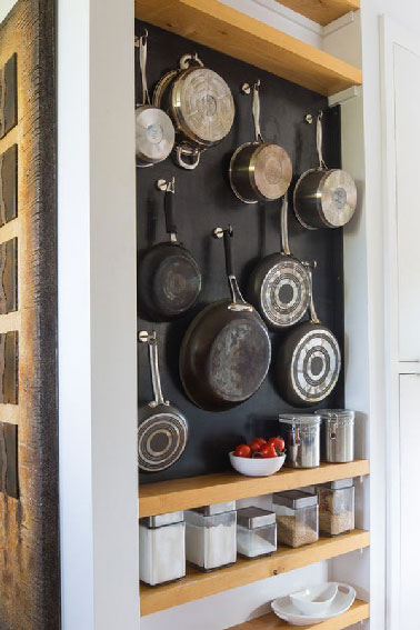Utiliser un mur en renfoncement dans la cuisine pour ranger casseroles et bocaux de verre, voilà une bonne idée gain de place.