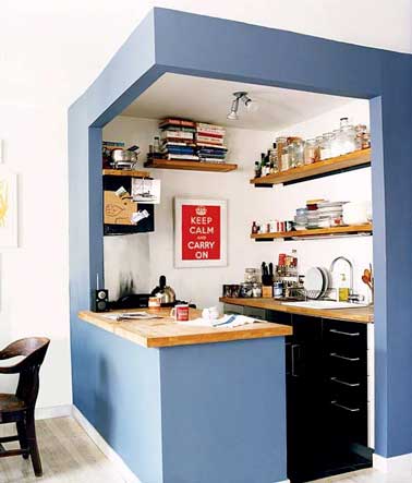 Une couleur de peinture délimite l'espace de cette petite cuisine. Les étagères de rangement envahissent tous les murs de cette cuisine pensée comme un bloc