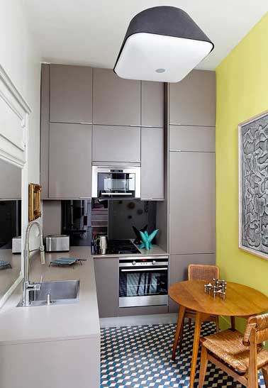 Gris et vert anis installent une ambiance design dans cette petite cuisine grise. Pour optimisez l’espace, le bloc meubles sol plafond a été réalisé sur mesure. Le sol en carreaux de ciment effet 3D et le miroir placé sur la crédence de cuisine ajoutent de la profondeur à la pièce. Ultra design : le mur de couleur vert anis choisit en contraste avec la petite table de cuisine et les chaises tressées en bois d’inspiration scandinave.