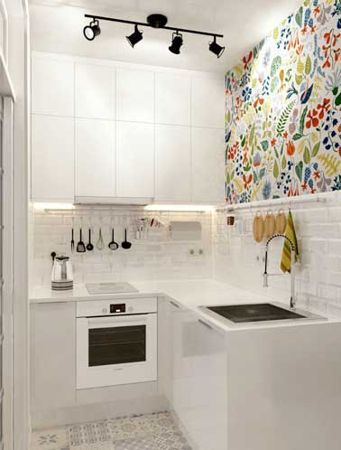 Côté déco une petite cuisine se pense bien souvent autour d’une couleur claire et satinée pour jouer avec la lumière même dans un petit espace sombre. Placée sur le plan de travail et la crédence de cuisine une source lumineuse augmente la profondeur de l’espace. En matière de peinture cuisine, les couleurs intenses et pop sont permises au même titre que les peintures de teintes neutres. Un papier peint imprimé pour personnaliser la déco de cuisine. Sur le sol, optez pour un carrelage grands carreaux, il améliore aussi l’impression d’espace dans la cuisine.