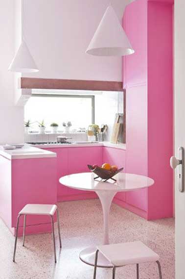 Déco de petite cuisine rose et blanc à croquer. Les meubles de rangement fuschia et la fenêtre lumineuse sur la crédence apportent profondeur à la cuisine.