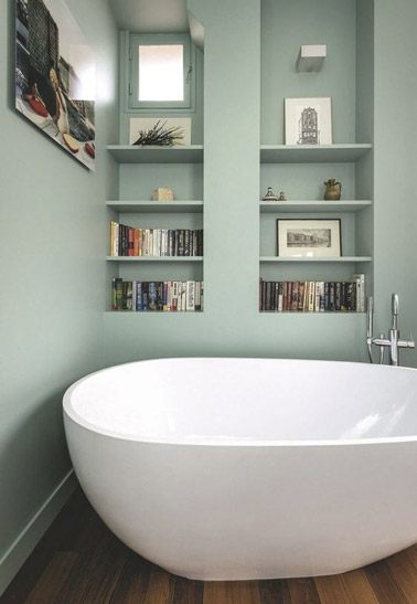 Du vert pastel sur les murs pour apporter de la douceur et une baignoire îlot pour souligner l’harmonie de la pièce, voilà une petite salle de bain au sol en parquet qui assurera des moments ultra relax dans la baignoire grâce à une petite bibliothèque aménagée dans les niches du mur ! Top et originale la déco !