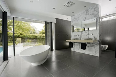 L’élégance de cette salle de bain design est soulignée par du carrelage gris anthracite, un délimiter à l’aspect marbre et une baignoire îlot trônant fièrement au milieu de la pièce. Les grandes baies vitrées offrent une jolie vue sur le jardin pour une salle de bain agréable ouverte sur l’extérieur.