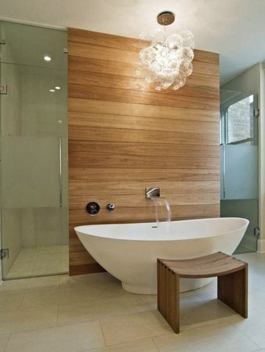 Une salle de bain bois accueille une baignoire îlot
