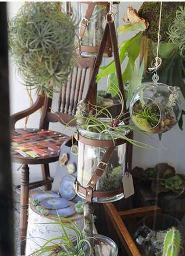 Une idée sympa pour aménager un coin jardin sur son balcon lorsque la place fait défaut : Une composition de plantes vertes, succulentes et plantes grasses accrochées dans des suspensions de cuir et verre sur le mur et le toit du balcon.