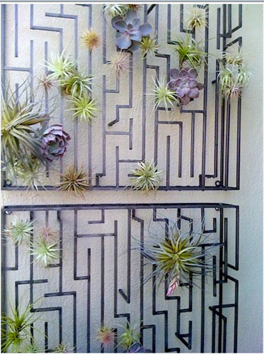 Aménagement d'un jardin sur balcon réalisé avec un mur de briques percées pour accueillir culture plantes grasses