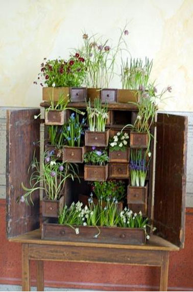 Comment utiliser un meuble ancien pour aménager un jardin sur un petit balcon : Laisser les portes du meubles ouvertes et remplir les tiroirs de terre après les avoir protégé d'une bâche plastique, puis planter bulbes à fleur, plantes aromatiques