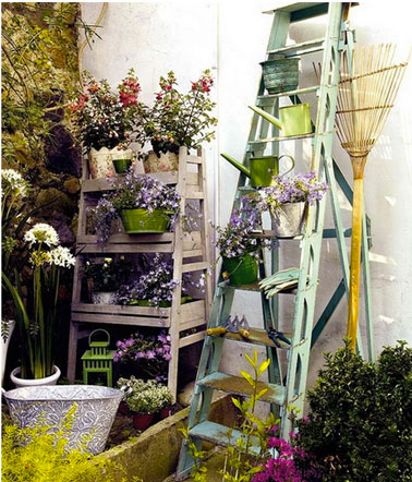 aménager un jardin de fleurs et plantes sur un petit balcon avec jardinière sur rambarde et échelle bois pour accrocher les pots et jardinières sur mur