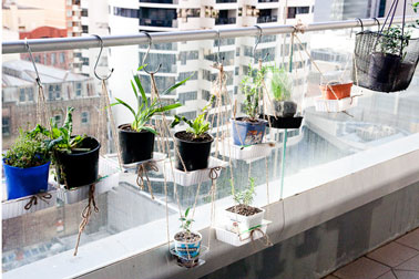 aménagement suspension pour fleurs et plantes aromatiques sur un balcon. Suspensions petites plantes fabriquées avec pots de culture et containers de récupération