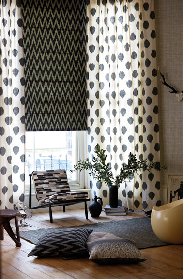 Booster la déco du salon avec des stores, rideaux et coussins à motifs graphiques et de couleurs tendance