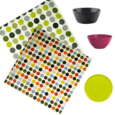 Une toile cirée pleine de peps sur la table, quelques vaisselles de couleur et voilà la cuisine qui s’illumine en quelques secondes ! Toile cirée à pois Bouchara Collection en 137cm de large, prix : A partir de 30€. Lot de 3 Saladiers : 30€, lot de 4 bols de 16cm, 12.50€, lot de 4 assiettes de 21cm diam. Prix 15€ collection Hot Summer chez zak-designs.org. Liste points de vente au 05 56 42 11 93.