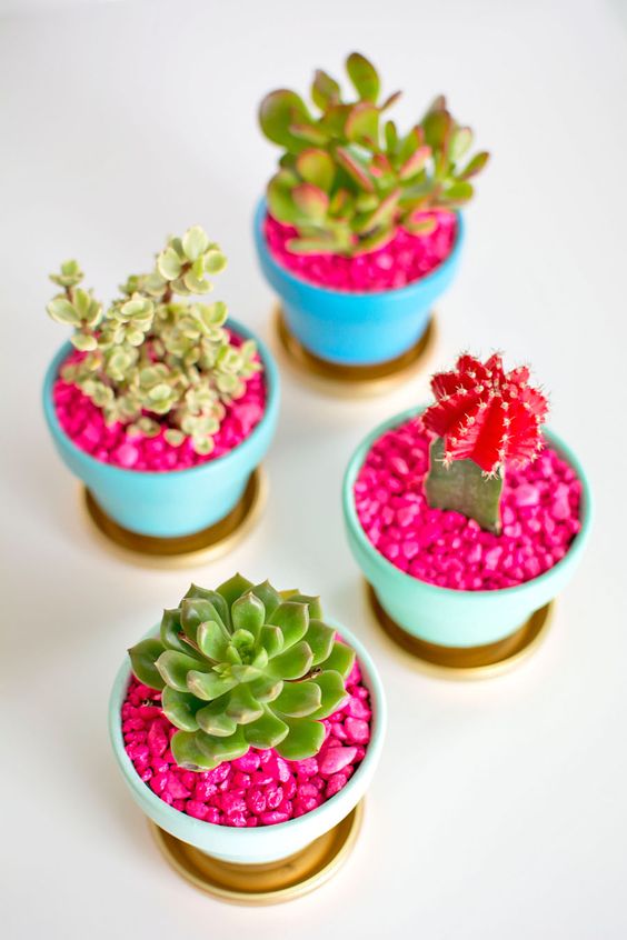 Et pour compléter votre pot, n’hésitez pas à ajouter quelques granules de couleurs sur la terre ou un joli cache-pot, qui se marieront à merveille avec le reste de votre décoration. Laissez parler votre inspiration !