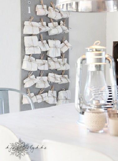 Peignez une dizaine de pinces en rouge et collez le ruban sur les autres que aurez peintes en blanc. Les surprises sont emballées simplement et crochées sur les pinces à l’aide d’une cordelette ou de chutes de pelote de laine. Un calendrier facile à fabriquer avec les enfants qui s’amuseront à réaliser les pochoirs à l’éponge.