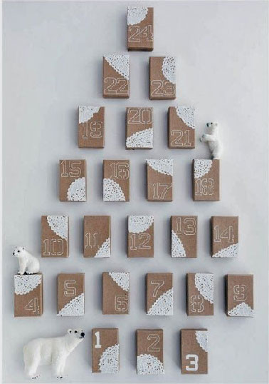 Une idée de calendrier de l’Avent à réaliser avec des petites boites en carton joliment décorées de dentelle en papier blanc découpée dans des napperons à gâteaux. Les dates sont écrites à main levée au crayon feutre blanc. Quand les 24 boîtes sont finies, elles sont fixées au mur avec de la Patafix. Des petits ours polaires sagement posés sur quelques boites surveillent qu’il n’y a pas de petites mains tentées d’ouvrir plusieurs boîtes le même jour !