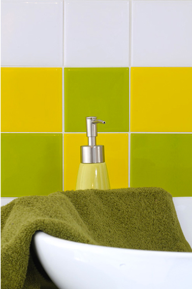 Carreaux adhésif Lot de 10 Rénostick couleur mimosa et vert anis pour carrelage de 10 x 10 cm. Prix 14.90 € le lot chez Castorama
