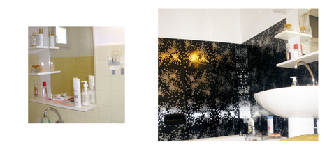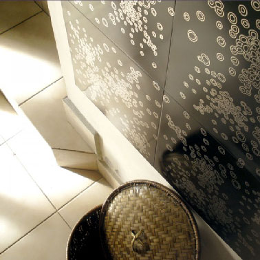 Un autre motif de carreaux aluminium posé en mural du sol au plafond qui présente les caractéristiques que le précédent. Leur faible épaisseur permet une découpe au cutter bien pratique autour de la tuyauterie et des éléments sanitaires. Dimension : 30×30 cm. Prix 38 € le lot de 3 carreaux aluminium finition noir dessin aspect inox.