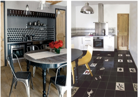 Du carrelage mural et sol qui donne du relief à la déco de la cuisine. A gauche, sur un fond de peinture gris anthracite, un effet 3D créé avec des grands cubes en carreaux de ciment noir et blanc. Ici c’est dans une cuisine vintage mais ce carrelage à un effet tout aussi spectaculaire dans une cuisine contemporaine. A droite, c’est un jeu de carreaux de ciment de la série Animaux créés par la désigner Marline Murat qui donne du rythme aux carreaux de ciment noir tein dans la masse de chez Carocim