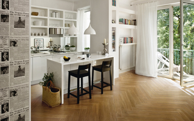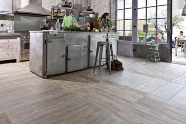 carrelage sol cuisine imitation parquet. Photo Iris Ceramica