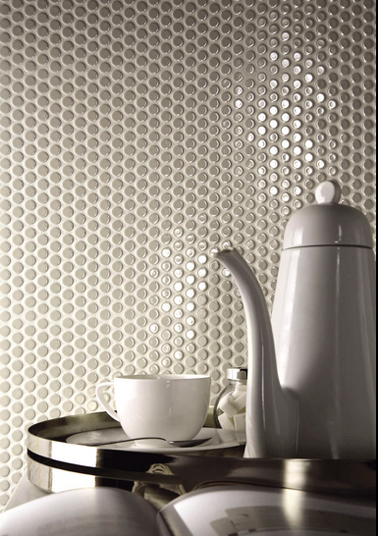 Un carrelage à poser sur une crédence ou un seul mur dans la cuisine pour en sublimer l’effet relief avec ses multiples pastilles qui de loin forment un joli effet paillettes. Carrelage fabriqué avec du matériel céramique non-vitreux. Dimensions des carreaux : 30×32 cm. se pose sans joint.  Grès émaillé mono-cuisson en pâte blanche émaillée Paillettes Bianco de Lea Céramiche.