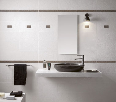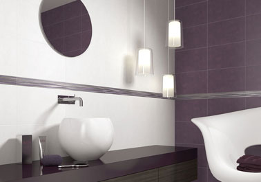 Faïence murale pour un jeu de couleur prune et blanc toujours très tendance. Dim : 25 x 40 cm 2 coloris 17.90 € le m2 réf Vénus. Le listel souligne les lignes du meuble sous-vasque. Listel Taslan 4 x 40 cm. Prix : 6.50 € la pièce chez Aubade.