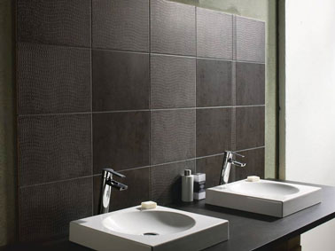 Dans une salle de bain, jouer sur le contraste des matières est toujours intéressant quelque soit le style déco recherché. Ici, c’est une déco sobre et élégante qui est mise en avant. Au relief de la faïence s’oppose le silence du plan vasque et des vasques blanches comme pour mettre en valeur la pureté des lignes et l’élégante du lieu. faïence murale dim : 25×33.3cm Réf. carrelage mural Futura noir.Leroy Merlin