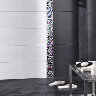 Un exemple de carrelage utilisé pour structurer l’espace dans la salle de bain. Ici, le carrelage noir de la douche à l’italienne, souligné d’une frise en verre coloré posée à la verticale marque l’espace de la douche italienne et s’oppose au blanc de la faïence du reste de l’espace. Réf : Faïence Nuagé mat. Dim : 25 x 40 cm. Frise verre sur trame dim : 10 x 30cm. prix 15.30 € Réf : Carrelage mural Vario chez Lapeyre.