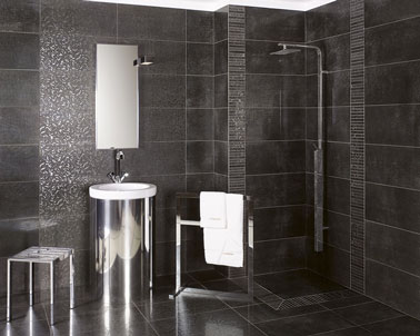Une magnifique salle de bain design gris acier. Carrelage salle de bain mural et sol en grès cérame émaillé. Dimensions des carreaux unis : 30 x 60 cm. Prix 47.50 € le m2. Carrelage décor dimensions 30 x 60 cm. 50 € le m2. Réf : Fashion chez Aubade.