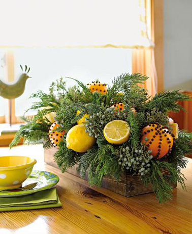 Pour réaliser ce centre de table gourmand, remplir le fond d’une caisse en bois avec de la mousse pour composition florale que vous trouverez chez votre fleuriste. Piquer ensuite dans la mousse des branches courtes de sapin, de conifères tels que thuya, cyprès empruntés aux haies de votre jardin. A l’aide de pics à brochette piquez quelques oranges, citrons et limes, pour leur donner une tige que vous piquez ensuite dans la mousse. Pour donner un doux parfum au centre de table, il est sympa de décorer les oranges avec des clous de girofle. Le tout sera très sympa et se réalise avec quelques euros !