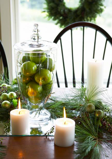 Un méli mélo de verts pour un centre de table lumineux à Noël. Pour réaliser ce centre de table, sur un miroir qui sert de chemin de table remplir une coupe de verre de pommes Granni Smith que vous complétez avec un mélange de branchages sapin, de pommes de pin et de boules de Noël vertes en mixant boules brillantes et mates. Terminez avec des bougies blanches. Une fois allumées, l’effet lumière des bougies sera multiplié grâce au miroir.
