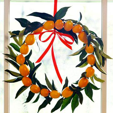 Une couronne de bienvenue dans la pure tradition réalisée avec des fruits frais. Formez un cercle d’environ 30 cm de diamètre avec du fil de fer pour former la base de la couronne. Avec du fil de pêche, fixez ensuite des feuilles de kumquats assez larges pour donner du volume à la couronne puis les fruits en chapelet. Il vous faut environ une vingtaine de kumquats pour réaliser cette couronne.