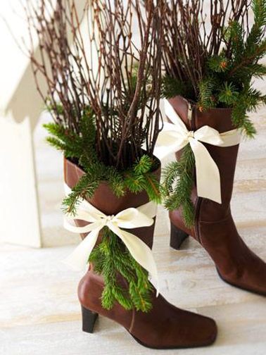 Et pourquoi ne pas utiliser des bottes qui dorment dans le placard pour décoration de Noël originale ? Commencez par bourrer les bottes avec du papier journal jusqu’à 15 cm du bord pour qu’elles se maintiennent bien droit. Ensuite composez un bouquet avec des branchages secs et quelques branches de sapin bien vertes. Nouez un ruban de satin clair autour du haut de chaque botte avec une autre branche de sapin.