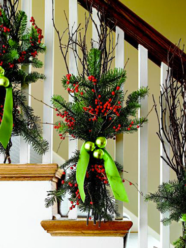 La rampe d’escalier est le support idéale pour décorer la maison à Noël. Toujours dans le même esprit, je fais mes décorations de Noël moi-même avec trois fois rien, composez les bouquets avec quelques branches de bois mort, deux ou trois branches de sapin et pour apporter de la couleur complétez la composition avec une branche de houx ou d’arbuste à baies rouges (pour les enfants, attention qu’elles ne soient pas toxiques). Assemblez le bouquet à l’aide de fil de fer fin. Attachez les bouquets aux barreaux de la rampe d’escalier à l’aide d’un ruban de satin, sans oublier les 3 boules de Noël pour le contraste couleur.