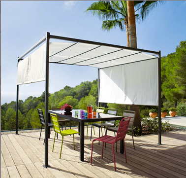 Le mobilier traditionnel revisité sur la terrasse avec les chaises métal peintes dans des couleurs festives. Les chaises Batignoles de Maison du monde sont disponibles en fushia, vert anis, noir et taupe et ne demandent qu’à être dressées ensemble autour de la table. Chaises Batignolles, métal peint, peinture époxy mate, dim : 42 x 50 x 82 cm : 49 €. Table Portofino, structure et pieds alu, plateau en polywood, disponible en 3 dimensions : 230, 180 et 100 cm de longueur : à partir de 399,90 €. Le tout à l’abri du soleil sous une tonnelle de jardin structure acier et toile écru : 249 €.