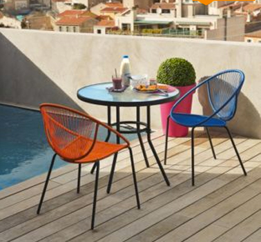 Du style et du confort sur la terrasse avec des fauteuils tressés, de la couleur pour illuminer la terrasse. Une touche de rétro chic sur une terrasse contemporaine. Fauteuil de jardin en acier à assise tressée orange ou bleu : 39 €. La table ronde en métal avec un plateau verre de 75 cm de diamètre et 77 cm de hauteur : 29€. Un petit salon de jardin qui trouvera aussi facilement sa place sur un petit balcon. Chez Alinéa.