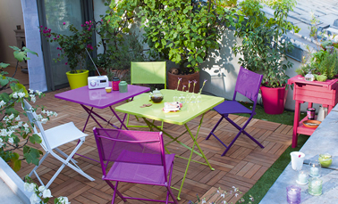 On mélange les couleurs pop des chaises et tables pour donner encore plus de tempérament à la déco de la terrasse et comme tables et chaises bistrot sont pliantes on en a toujours sous la main lorsque les convives se font nombreux dans le jardin. Chaise pliante Saba Structure en acier, finition poudre polyester, Dim : 52 x 46 x h.81cm. Toile PVC et polyester, disponible en violet, vert anis et blanc : 19.9O €. Table carré pliante Saba 70 x 70cm couleur bougainvilliers et vert. Structure en acier Finition poudre polyester : 45.90 € chez Castorama.