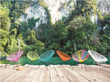 Des fauteuils et couleurs qui s’empilent sur la terrasse
