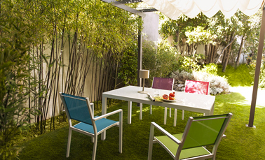 Des meubles aux lignes sobres, des fauteuils qui affichent la couleur autour d’une table grise, de quoi faire de sa terrasse un espace de détente au coeur d’un jardin verdoyant. Fauteuil : Structure en aluminium finition poudre époxy – Toile PVC et polyester. Dimensions : 55 x 60,5 x h.86 cm. Couleurs disponibles : Rose, vert, violet et bleu. Prix : 39 € à compléter par la table dans le même matériau pour la structure et au plateau en verre trempé. dimensions : 150 x 90 cm. Prix 99 € collection Atlantis Blooma chez Castorama.